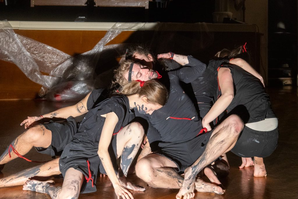 This exam production was developed as part of the Movement III and Actor and Choreography I courses in the second year of the Acting and Media program at APURI. The focus was on exploring physical expression, kinesthetic awareness, spatial-temporal relationships, and the creation of stage compositions—key objectives of these courses. The music and lyrics of Adam Semijalac from the albums Tanac za crnega vraga and Ode dite (for which he received the Franjo Ksaver Kuhač Award from the Croatian Composers’ Society in 2023) served as both inspiration and a foundation for emotional and physical exploration. In the production, these compositions became a platform for heightening bodily awareness, spatial relationships, group dynamics, and the potential meanings of movement. Through this process, students develop the body as a primary instrument of acting expression, deepen their physical articulation, and uncover possible dramaturgies of movement. To the rhythm of Semijalac’s modern rage and sorrow (folk blues), they explored dynamics, textures, and motion, where physical articulation was not merely a performative technique but a means of conveying experience and storytelling. How can the body express sorrow, struggle, fear, resistance, and love? Can art serve as a medium for healing and resistance? How does one find the strength to continue through misfortune? For students—future actors—these questions are of great significance, as they encourage and nourish the body not only as a vessel of emotions and thoughts but also as an expression of defiance, compassion, and solidarity.